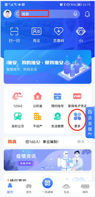 下载“i淮安”APP并登录,在首页“更多”应用中的“疫情专栏”栏找到“核酸检测”菜单或在首页快捷搜索栏输入“核酸检测”搜索。