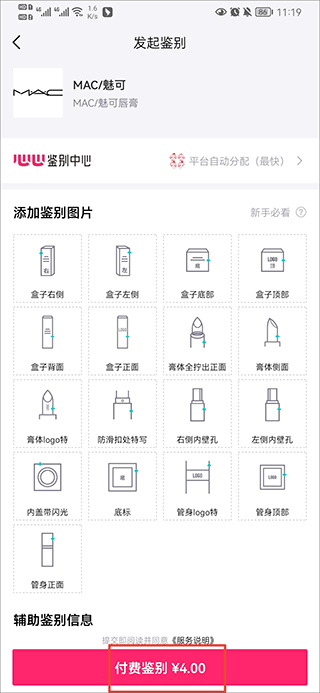 4、最后按照要求上传鉴别图片后,支付鉴别金额即可