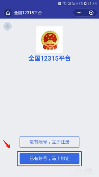 2、输入自己的全国12315平台账号,点击“立即绑定”