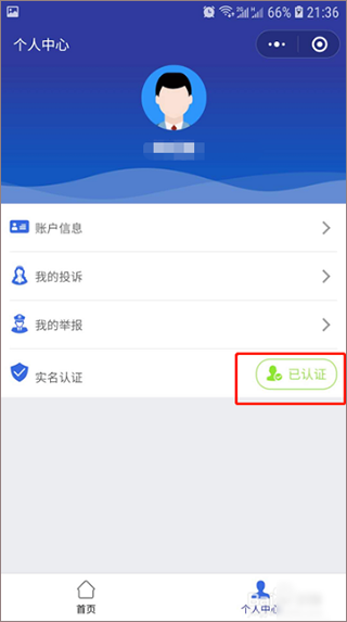 7、通过人脸识别后即可确认为本人操作完成实名认证,回到个人中心可以看到实名认证显示“已认证”。