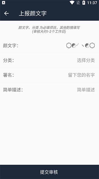 4、接下来只需要填写,分类和留下编辑人的名称,审核通过了就可以在表情里面查看到了。