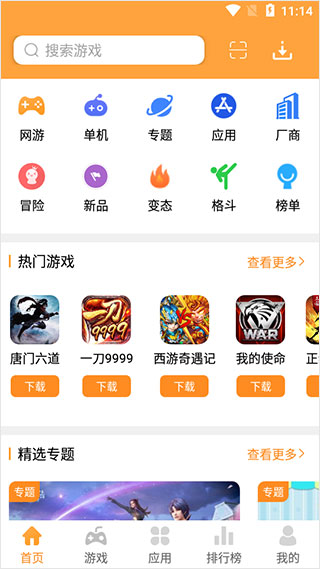 2、点击下方游戏栏,可以看到网游、单机、新品榜游戏以及诸多类型的游戏;