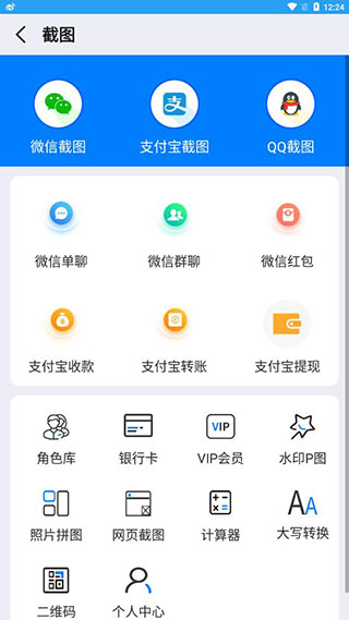 1、下载微商截图侠安卓版后打开可以看到有做个截图、水印P图、网页截图、拼图等常用功能;