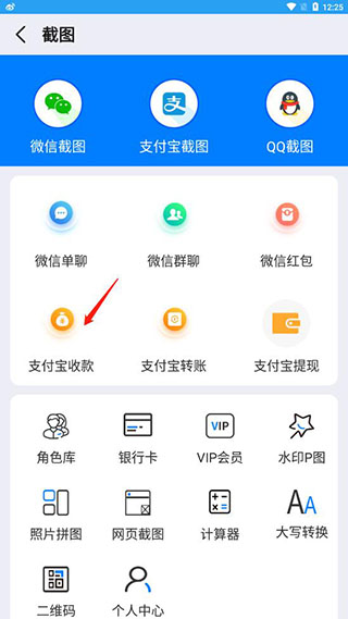 3、进入后可以看到里面有多种截图类型,比如微信、支付宝、QQ等等;