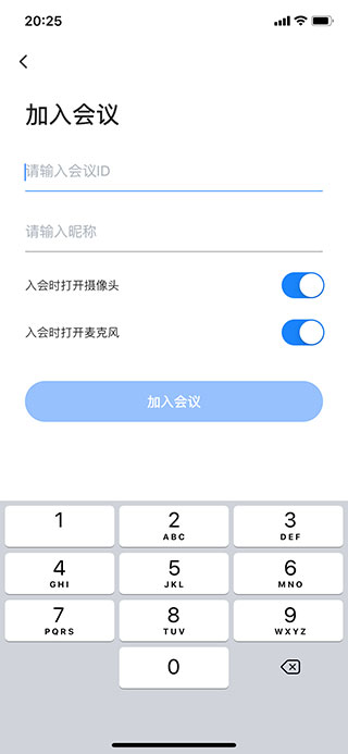 未注册过网易会议app的用户,可以直接点击首页的加入会议按钮进行匿名入会,匿名入会界面如下图所示。用户需要输入正确的9位/10位会议ID,并输入会议昵称,方可加入会议。用户还可以选择入会时是否打开摄像头和麦克风。点击加入会议按钮,将加入该会议ID房间。