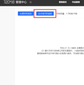 3、进入发布页面,点击从本地文件增加按钮,根据您的具体需要选择是否在即将要上传的2:1或六面体全景图片中加入720yun水印,如需要点击上传并加水印,如不需要点击上传但不打水印;