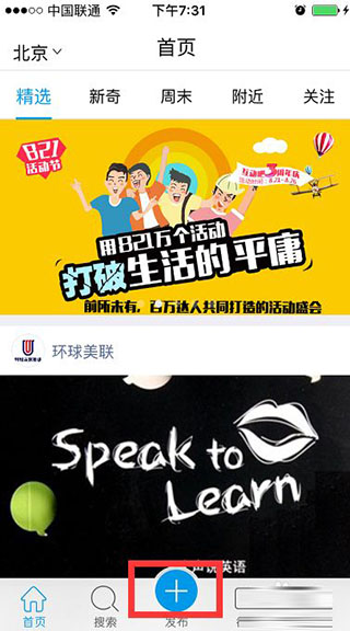 1、下载并进入App首页,在这里您可以看到许多好玩的信息和活动展示,在这里点击页面底端“发布”键,来免费创建发起活动。