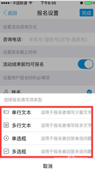 6、报名设置功能中的“添加自定义填写项”内,可以根据活动发布者自身需求,以单行文本、多行文本、单选、多选的方式设置需要报名者填写的信息内容和形式。