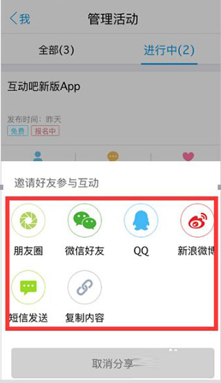 10、活动成功发布后您可以点击“分享”按钮,一键推广活动到朋友圈、微信好友、QQ、新浪微博,您也可以通过短信发送,或者通过“复制内容”功能发布在希望推广的地方。