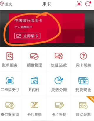 3、登录成功之后,点击最下方一栏的“用卡”,开始绑定我们的中国银行的信用卡;