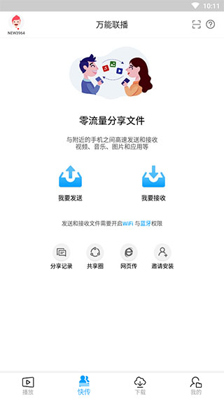 2、零流量快传,打开你的蓝牙和WIFI权限,即可与附近的手机进行高速发送和接收视频、音乐、图片和应用等 。