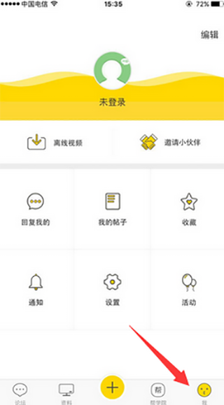 进入主界面,点击左上角的“个人中心”,登录自己的账号,可以查看回复我的、我的帖子、收藏、通知、活动、设置等功能。如下图所示: