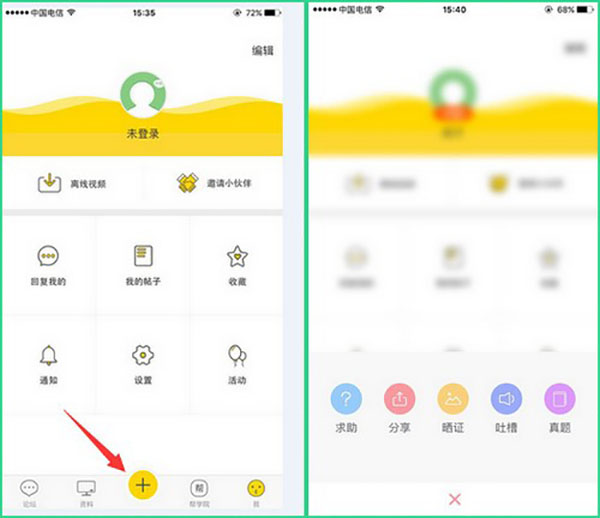 点击“+”可以进行求助、分享、晒证、吐槽、真题等一系列操作。如下图所示: