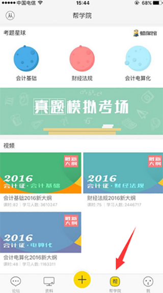 点击下面的“帮学院”,可以看到里面有会计基础、财经法规、会计电算化等模拟题,和一些免费视频。如下图所示: