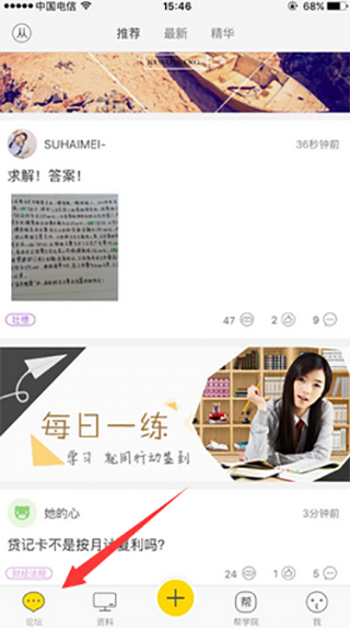 点击左下角“论坛”,可以看到同学的发帖和每日一练。如下图所示: