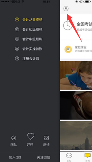 点击左上角“从”,可以查看会计的分类项目以及加qq群和关注微信。如下图所示: