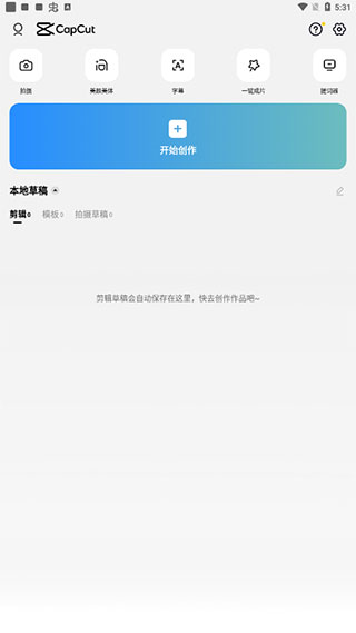 1、下载安装之后打开Capcut剪辑APP,点击开始创作进行视频剪辑,点击创作后,需要先选择素材视频,进入编辑页;