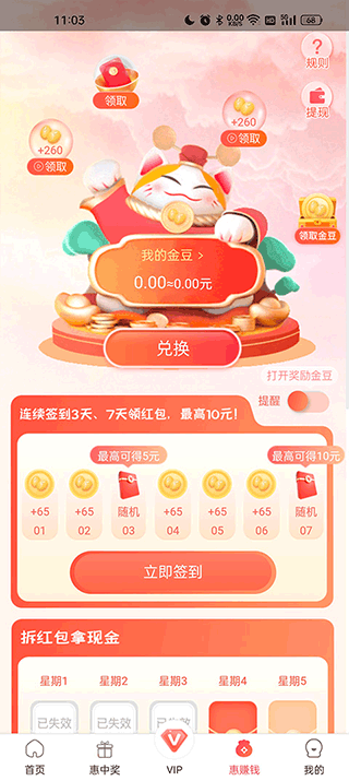 3、个人中心,收益、金豆、优惠券,一目了然。