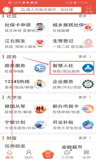 1、进入软件后,在下方菜单栏中找到“城市”-“政务”-“智慧人社”