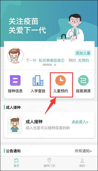5、绑定儿童之后,首先点击儿童预约并进入预约页面,接着点击接种预约即成功预约;