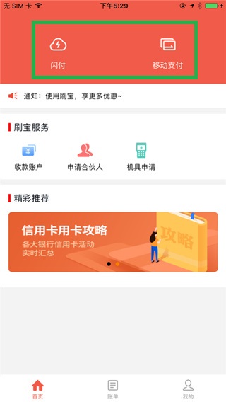 1、下载安装之后打开刷宝APP,进入软件首页可以在上边进行支付或收款;
