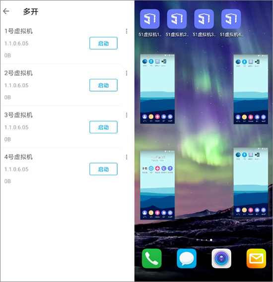51虚拟机支持一台手机同时运行多个51虚拟机实例,实现多窗口。一个手机就可以同时5小窗口,组队升级好帮手。