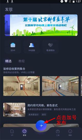 1.下载安装之后打开如视VR APP,点击中间的加号可以发布自己的视频和照片其他。