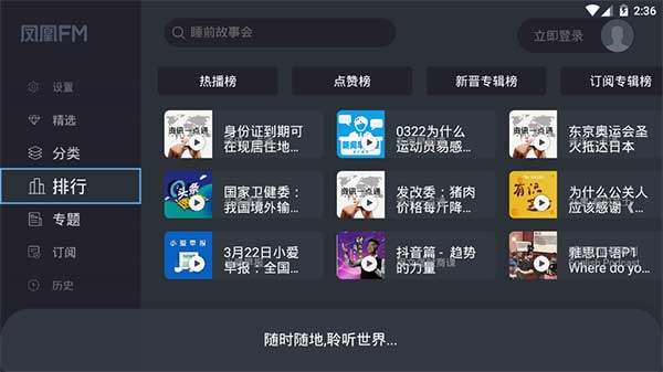 4、类别全面:凤凰FM拥有新闻、财经、公开课、有声书、谈话、娱乐、相声、文史军事、亲子、社会、生活等海量内容。