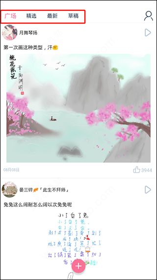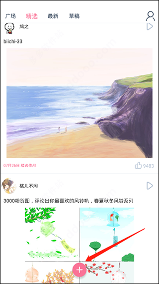 1、下载安装后打开漫芽糖指绘APP,软件拥有广场、精选、最新、草稿四大模板;