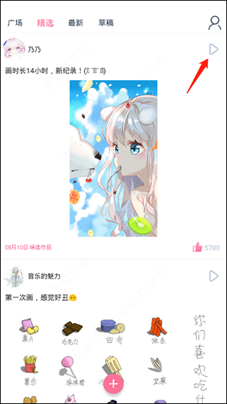 2、在精选功能界面可以看到其他用户的优秀作品,可以点赞,还能通过视频查看详细的查看到作品笔数,和绘画的全过程