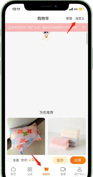 打开APP,选择下方购物车,然后点击右上方自定义。
