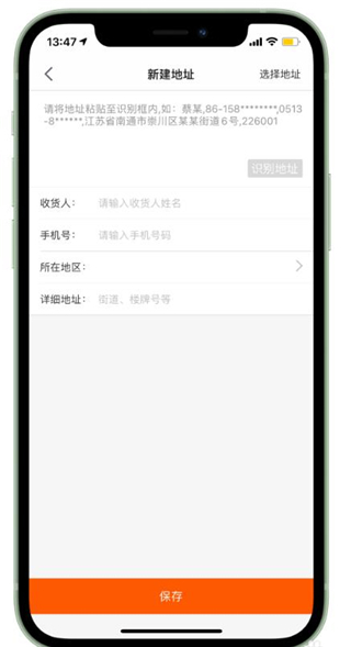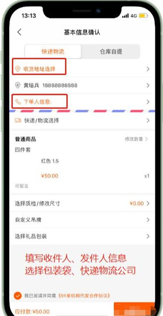 点击收货地址选择,填写收货人信息;点击下单人信息,填写下单人联系方式
