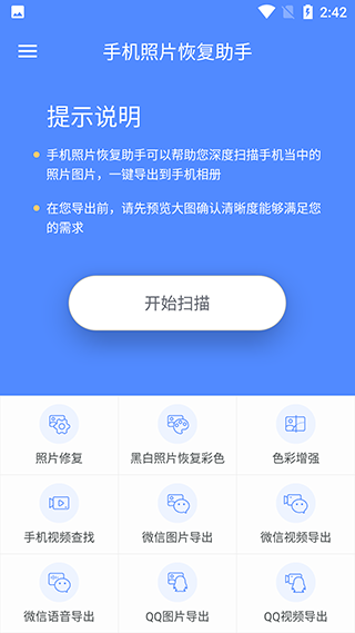 1、下载安装后打开软件进入首页,点击开始扫描即可开始扫描已经删除的图片。