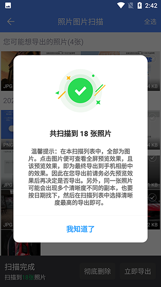 3、勾选需要恢复的照片,点击彻底删除将永久删除照片不可恢复,点击立即导出可以将照片恢复到指定相册。