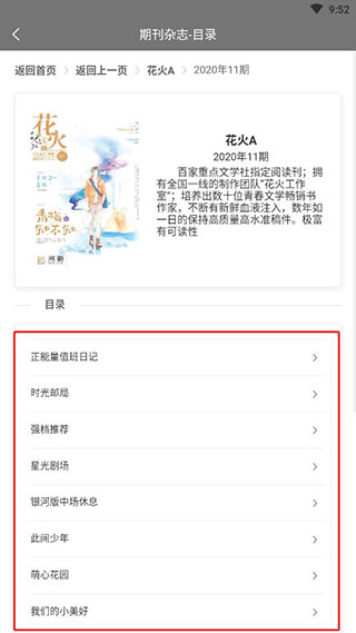 2、如果在推荐中看到有喜欢的期刊就可以点击进入选择观看,比如进入花火,可以选择想要的;
