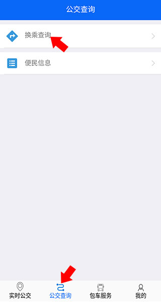 4、如果想要查询换乘线路,那么点击【公交查询】-【换乘查询】。