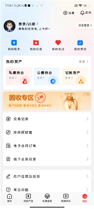 私募排排网是一款为私募基金从业人员和投资者提供服务的应用程序。它通过整合行业资讯、基金产品、投资经验和专业知识,帮助用户更好地了解私募基金市场,提高投资决策的能力。在私募排排网上,用户可以获得全面的私募基金市场分析和报告,了解市场动态和趋势,获取投资机会。用户还可以查看各类私募基金产品的详细信息,包括基金公司、基金经理、投资策略和历史业绩等,帮助用户做出明智的投资选择。私募排排网还提供专业的投资经验和知识分享,包括投资理念、风险管理和投资技巧等,帮助用户提高投资水平和风险意识。用户可以参与讨论和交流,与其他投资者和基金经理分享经验和观点。此外,私募排排网还提供一对一的私人咨询服务,用户可以与专业的投资顾问进行在线沟通,获得个性化的投资建议和指导。总之,私募排排网致力于为用户提供全面、专业、便捷的私募基金服务,帮助用户实现更好的投资收益。