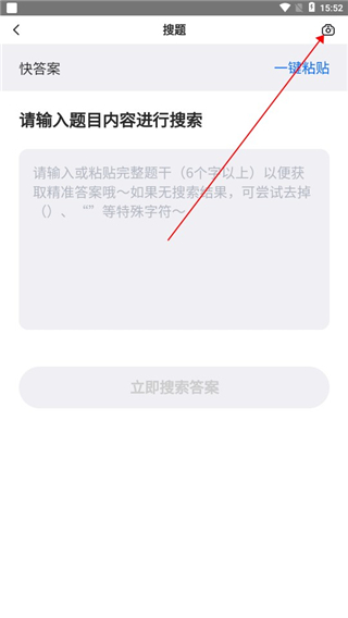 2、之后我们可以点击右上角的照相机图标进行题目的拍照搜索,当然也可以直接复制题目进行搜索哦,非常的方便,赶紧下载试试吧!