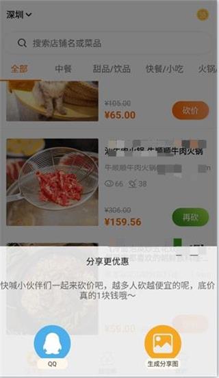 2、登录之后软件会自动进行定位,我们可以刷到附近的美食,找到想要的商品,点击砍价