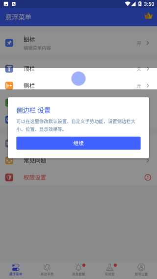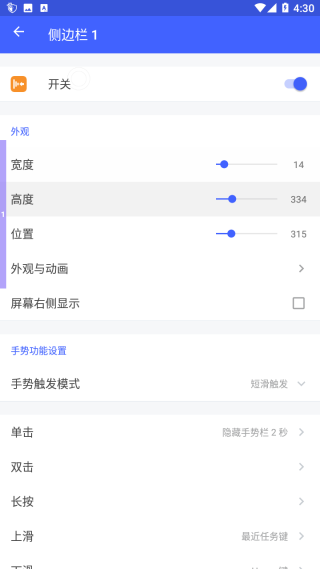 3、在"悬浮菜单"板块中点击侧栏(非正式版只能开启一个侧栏),点击侧边栏1进入如图所示,功能开启,上下左右滑动、单击双击作用都在本页面,还可以根据自己的喜好更改