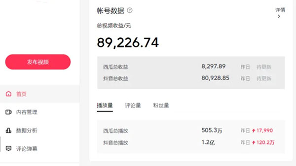 仔细看图的朋友会发现,总收益其实是包含两个方面的,一个是西瓜视频收益,另一个是抖音收益。