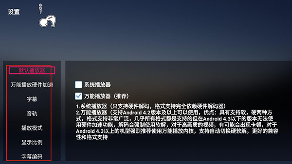 3、在设置中还可以设置播放器、字幕、音轨、播放模式、显示比例、字幕编码等等。