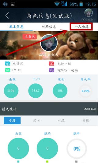 4、在这儿能够查询人物角色基本资料和pk信息内容,点一下右上方的本人库房;