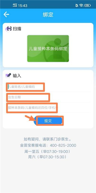 4、输入儿童姓名,出生日期,手机号码之后,单击“提交”