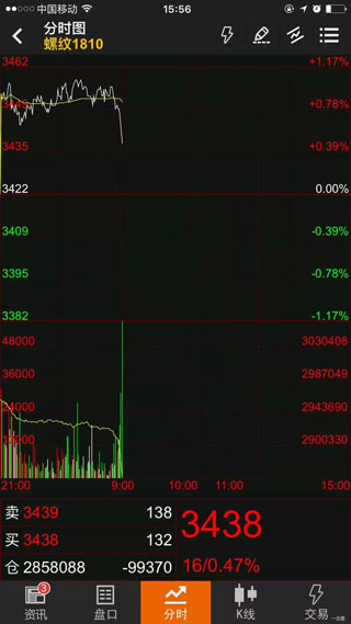 点击合约后默认进入分时走势图,分时走势图可以直观地看出当前价格走势,方便投资者了解当天价格详细走势。同时可以通过点击下方“资讯”“盘口”“K线”“交易”来切换至相关页面。