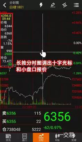长按K线图、分时图界面可调出十字光标