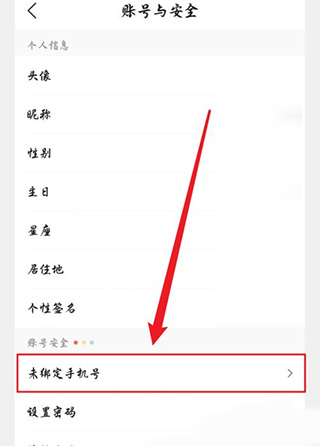 4、接着,点击账号与安全中的【未绑定手机号】选项。