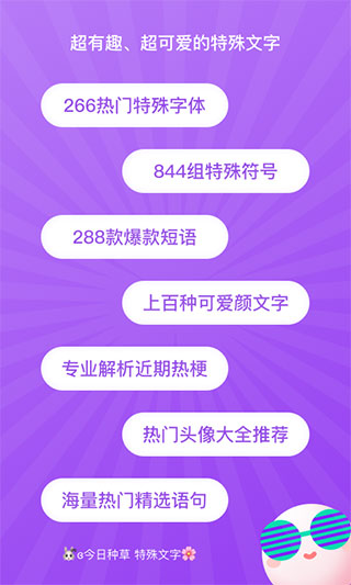 特殊文字是由深圳链条科技有限公司推出的一款集成了各式字体、颜文字符号的特殊文字在线制作软件,该软件也被叫做特殊文字生成器,该软件能够生成一些可爱的小字体、颜文字等多种文字,两百多种特殊字体,八百多中特殊符号,上百种颜文字让玩家眼前一亮,且软件用法简单,能够让用户轻松玩转,让你的朋友圈社交软件充满个性!软件完全免费,不收取任何费用就能够使用全部的内容,手写体、花体字、空心体、哥特字体、可爱字体以及粗体、斜体等字体等待着玩家前来使用欣赏,感兴趣的朋友不妨赶紧下载试试吧!