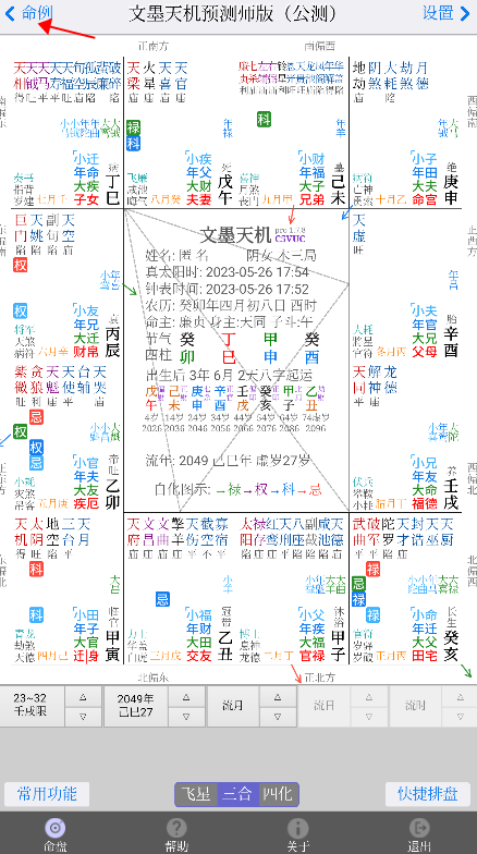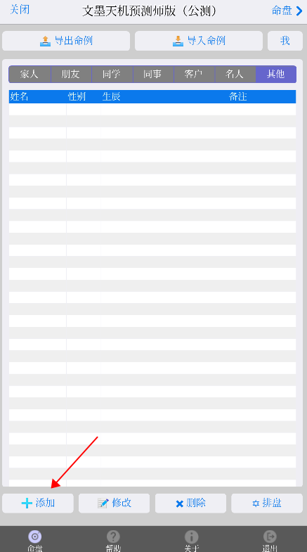 1、初次使用文墨天机App的用户,往往依据以往使用其它App的操作习惯,每次排盘都先在“命例”页面里点击“添加”按钮(如下图所示)。这样虽然可以排盘,但是操作上略显复杂,需要反复切换页面。其实,有更简单的操作方法。