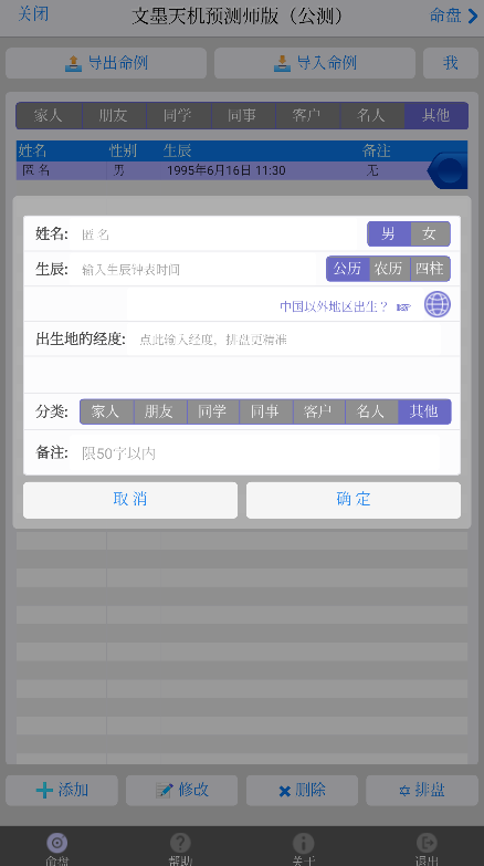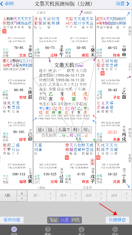 2、在排盘页面,点击右下角的“快捷排盘”按钮,弹出生辰输入窗口输入生辰后点击“排盘”按钮即可快速排盘。如果您希望保持此命盘,可以在输入生辰的同时选择“保存到命例库”为“是”,然后指定分类,即可直接将此盘存入命例库,无需切换到命例库页面操作。点击“排盘”即可 (如下图所示)